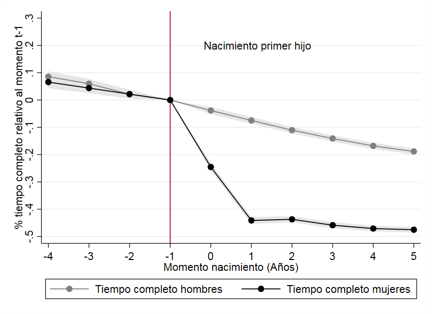 - La probabilidad de estar trabajando a tiempo completo cinco años después de la maternidad se reduce en el caso de las mujeres.
