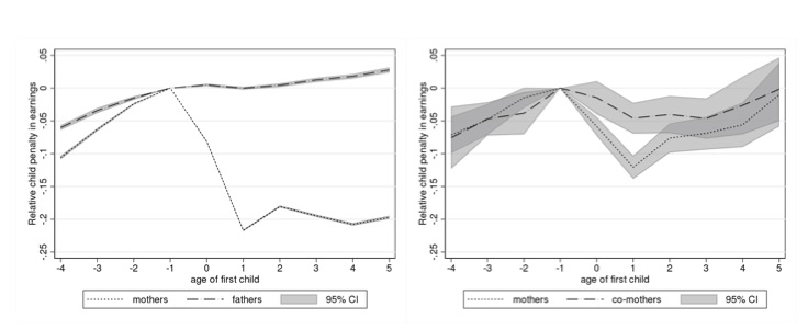 Otro estudio relevante es el que compara la brecha salarial tras el primer hijo entre parejas heterosexuales y lesbianas en Noruega para observar si la carrera profesional de las madres biológicas se resiente de la misma manera. En este caso, el impacto es diferente, ya que, mientras que en las primeras la madre sufre un recorte de ingresos del 20%, sin que afecte al padre, en las segundas la reducción es del 13%, aunque su pareja también sufre una caída salarial del 5%. Así pues, si bien el impacto global en los sueldos de la pareja es muy similar, el reparto de cargas dentro de la misma es algo diferente. Además, en las parejas heterosexuales la citada "brecha" se prolonga en el tiempo, mientras que en las lesbianas se cierra al cabo de 5 años.