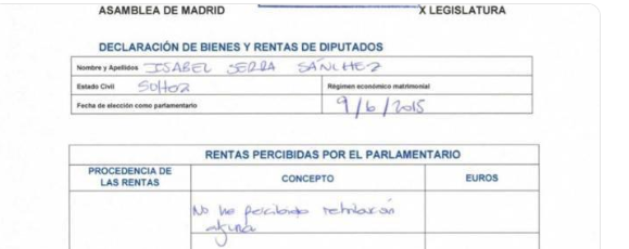 Esta información viene refrendada por la Declaración de Actividades que deben completar los diputados autonómicos al tomar posesión de su cargo. En dicho documento, registrado en la Cámara regional de la Asamblea, Serra admite no haber desempeño trabajo alguno en los años anteriores a su entrada en el Parlamento autonómico. Además, Serra señala que su pago por IRPF fue de cero euros antes de su desembarco en la política madrileña.