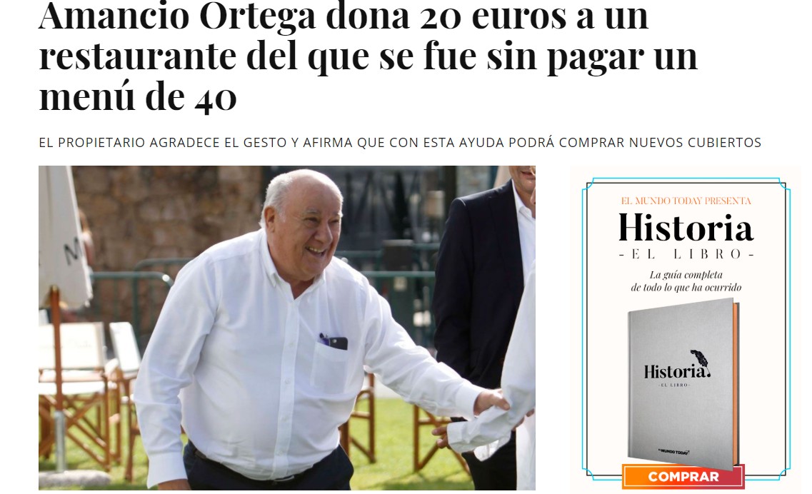 "El acto de entrega de los 20 euros se produjo esta mañana en el salón principal del local, con gran expectación mediática. Cuando vimos que la semana pasada se iba sin pagar los 40 euros jamás imaginamos que volvería para hacer esta donación de 20 euros, relata una emocionada camarera. Ha demostrado ser un hombre de los pies a la cabeza, añade. El hombre más rico de España entregó un billete de 50 euros al restaurante recibiendo posteriormente 30 euros de cambio", rezaba un irónico artículo en uno de sus párrafos.