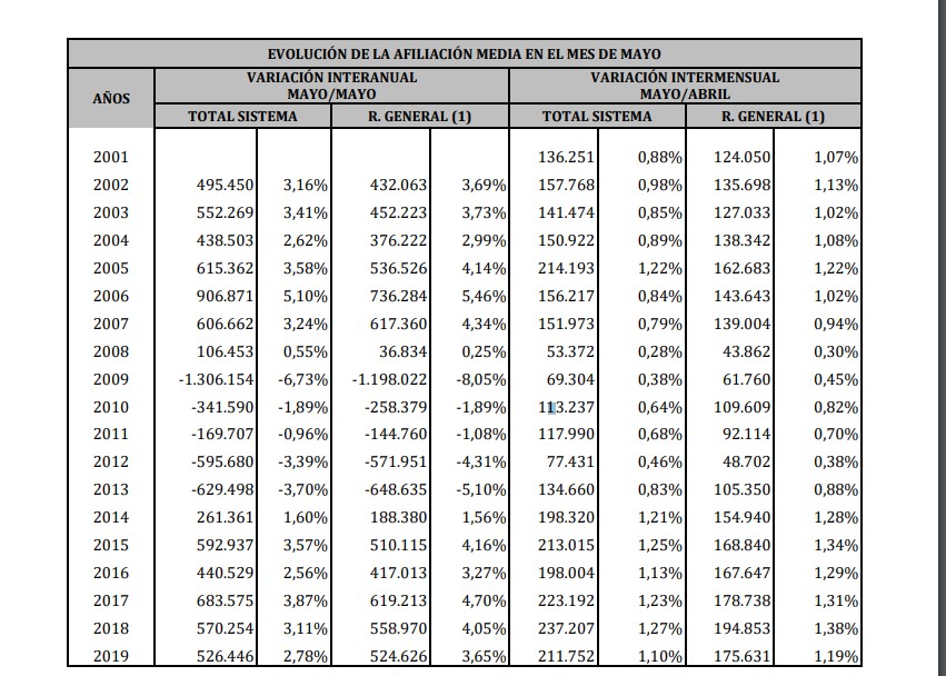 En valores interanuales, la afiliación ha crecido en 526.446 cotizantes desde mayo de 2018 (+2,8%).