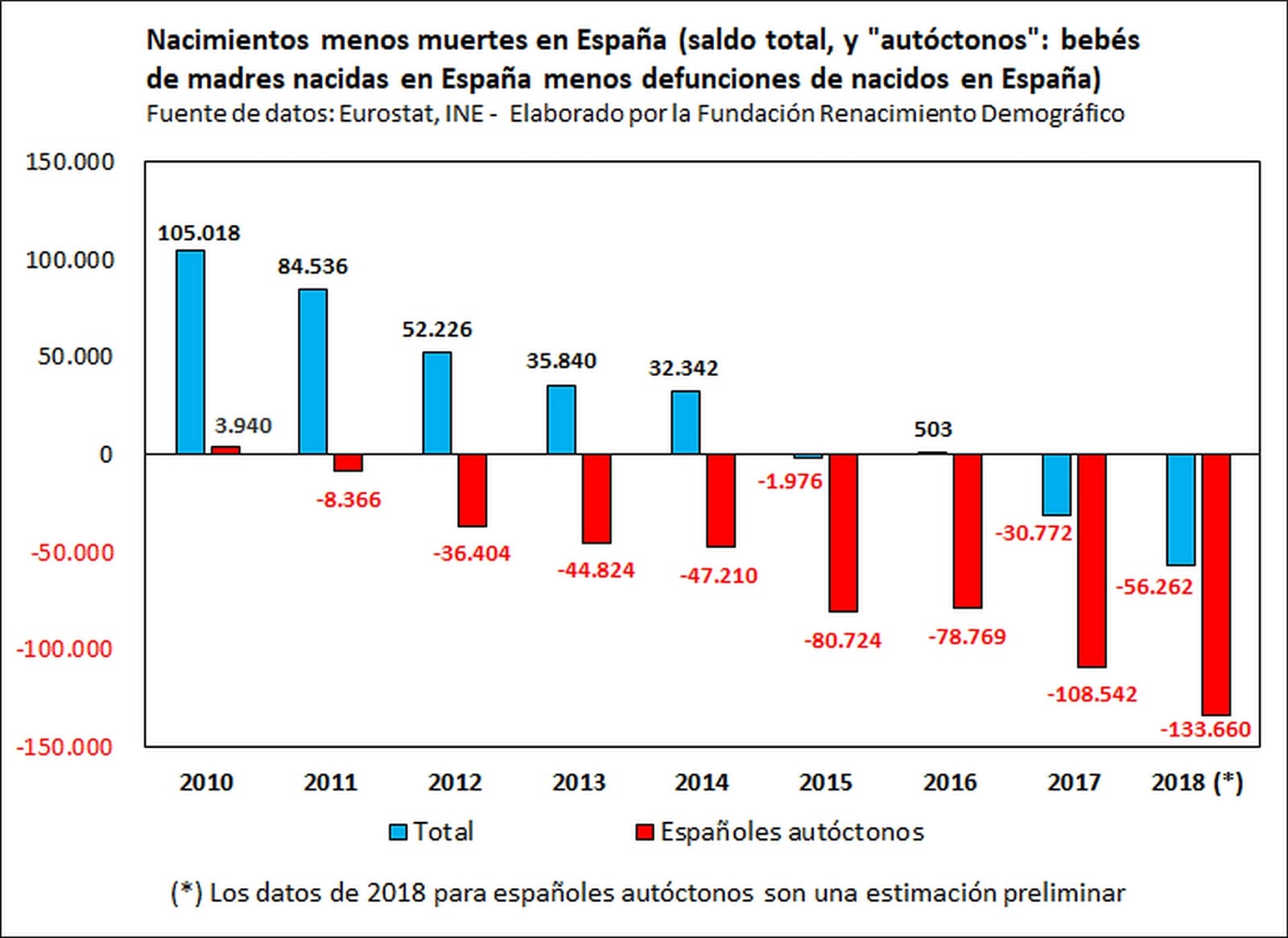 - En 2018, España registró 56.751 muertes más que nacimientos y unas 130.000 más en el caso de españoles autóctonos.