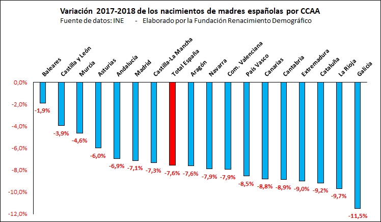 - La caída en el número de hijos de españolas fue especialmente abrupta en Galicia, seguida de La Rioja, Cataluña, Extremadura, Cantabria, Canarias y País Vasco.