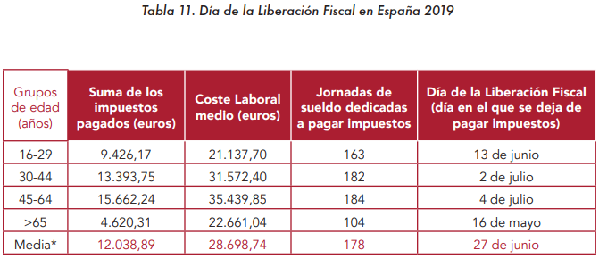 En términos monetarios, estos significa que el contribuyente medio paga algo más de 12.000 euros al año en impuestos, unos 1.000 euros al mes, lo que equivale al 42% de su sueldo real (el coste laboral medio, incluyendo IRPF y cotizaciones de empleado y empleador, asciende a 28.698 euros al año). Esta carga varía en función de la cohorte de edad de los trabajadores, al oscilar entre los 9.426 euros de media que abonan los jóvenes menores de 30 años (normalmente con sueldos más bajos) y los 15.662 de los profesionales ubicados entre los 45 y 64 años. Los jubilados, mayores de 65, son, con diferencia lo que menos impuestos pagan, al estar exentos de cotizaciones sociales.