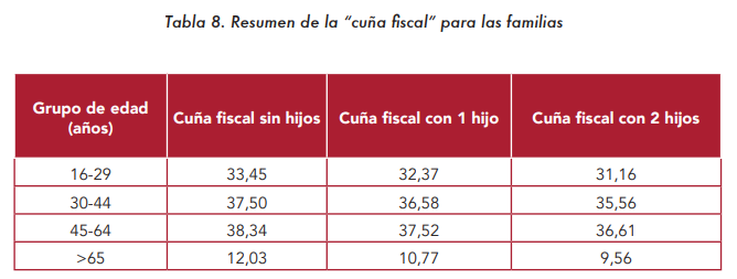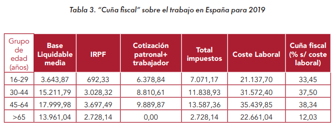 Así, los jóvenes de entre 16 y 29 años cobran de media 66,55 euros por cada 100 euros de coste laboral (sueldo real), dado que su "cuña fiscal" asciende al 33,45%; entre 30 a 44 años, se sitúa en el 37,5%; de 45 a 64 años, el trabajador apenas retiene 61,66 euros de cada 100 abonados por la empresa (38,34%); finalmente, entre los mayores de 65 años, la fiscalidad directa supone que, de cada 100 euros, se perciban aproximadamente 88 de forma efectiva, con lo que la su "cuña fiscal" baja al 12,03% por la ausencia de cotizaciones sociales.