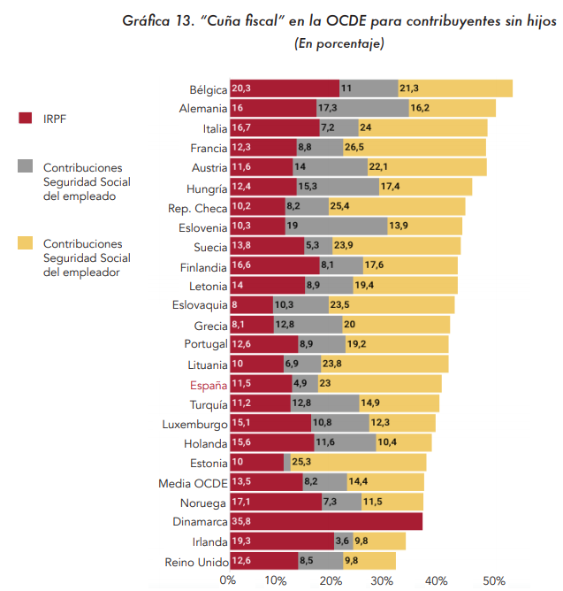 "Solamente 15 de las 34 economías desarrolladas que integran la OCDE tienen una cuña fiscal más alta que la de España, lo que significa que las otras 19 mantienen unos gravámenes al trabajo menores. No se sostiene, por tanto, el mito de que España es un país de impuestos bajos", según señala el informe.