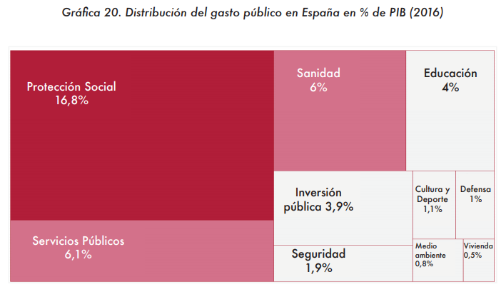 Llegados a este punto, cabe preguntarse qué reciben los contribuyentes a cambio de tener que entregar más del 40% de su sueldo real al Fisco. España dedica el 42,2% de su riqueza al gasto público, lo que supone en torno a 472.000 millones de euros anuales para sostener, básicamente, el llamado "Estado del Bienestar", cuyo coste ronda los 315.000 millones (28,1% del PIB).