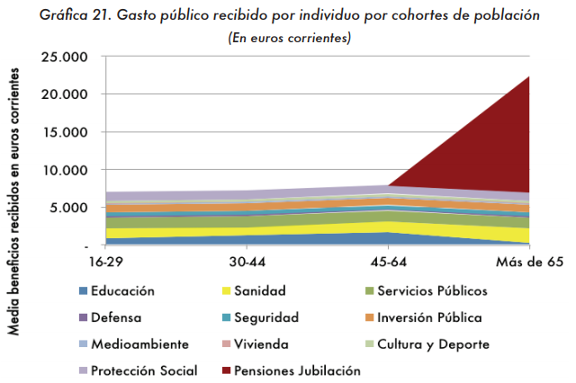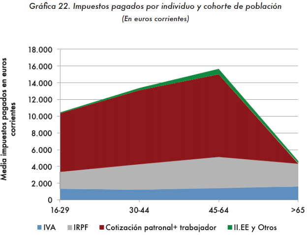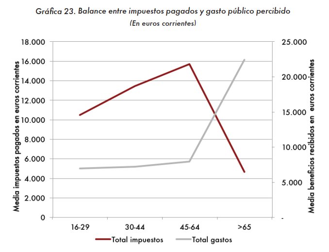Por otro lado, el principal "beneficio" estatal que percibe un contribuyente es la pensión pública (15.454 euros anuales a precios corrientes), seguido del gasto sanitario (1.919,68 euros). Estas prestaciones, sin embargo, son mucho más reducidas durante la vida laboral del contribuyente: entre 45 y 64 años, los tres "beneficios sociales" más importantes son la educación (1.624,25 euros anuales), los servicios públicos (1.461,84) y la sanidad (1.451,47); mientras que en las cohortes más jóvenes, los gastos más relevantes son los de los servicios públicos, seguidos de la sanidad y la protección social.