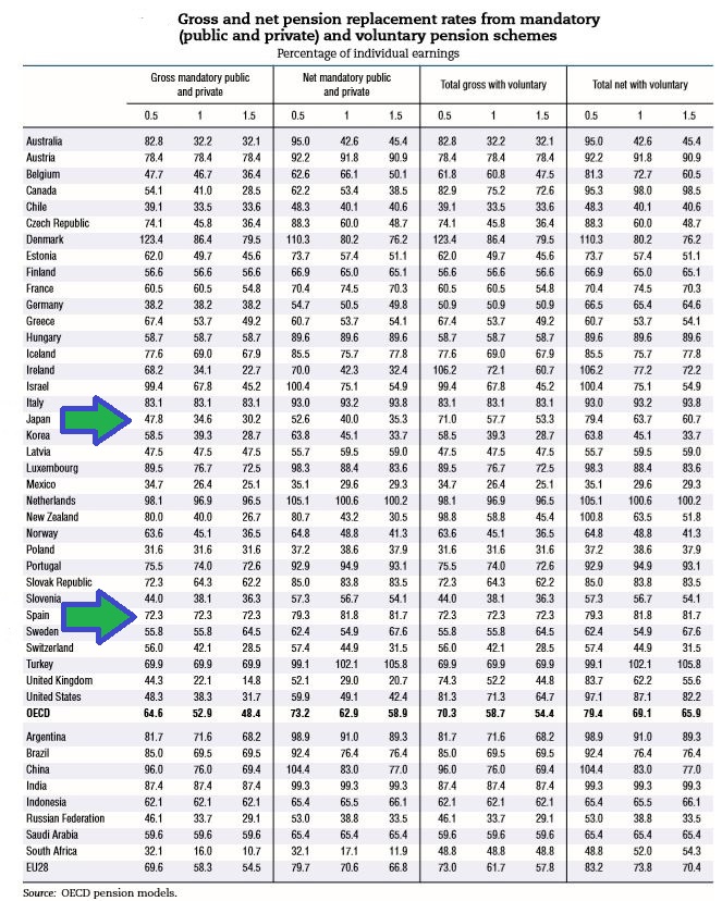 Aquí viene el segundo elemento para el análisis. Volvemos al informe de la OCDE sobre las pensiones en los países ricos. En las páginas 109 y 113 de este documento, tenemos las tablas con los datos sobre la generosidad del sistema de pensiones de cada país. En el primer caso (tabla de la derecha, en inglés, click para ampliar) se muestran las tasas de reemplazo en función de la renta del beneficiario (0,5 – 1 – 1,5 de los ingresos medios de cada país). Esta ratio mide el nivel de la pensión respecto a los ingresos previos a la jubilación. Pues bien, como podemos comprobar, España es uno de los países con un sistema de pensiones más generoso del mundo, con una tasa de reemplazo neta superior al 80% para el pensionista medio (en la OCDE, la media es del 69,1%). En Japón, la cifra es del 63,7%.