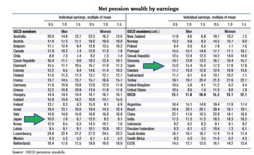 Además, la OCDE incluye otra tabla que no suele analizarse tanto pero también es muy interesante (ver tabla inferior de la derecha, click para ampliar). Nos referimos a la que recoge el valor-riqueza de la pensión. Es decir, a cuánto equivalen los ingresos previstos para cada pensionista en el momento de su jubilación (valor presente neto de todos los flujos de renta previstos). Pues bien, de nuevo, España es uno de los países más generosos de la OCDE, muy por encima de otros mucho más ricos. Así, para un hombre de ingresos medios, el valor presente neto de los cobros que tendrá de la Seguridad Social equivale a 15,4 años de su renta. La media en la OCDE es de 11,8 y en Japón esta cifra es de 7,6 años.