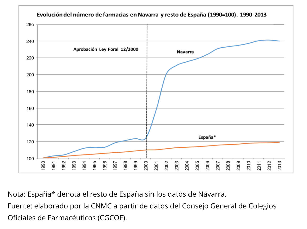Aunque la farmacia está muy intervenida por la legislación económica nacional, Navarra es la excepción a esta regla. En el año 2000, la comunidad foral introdujo una notable relajación de estas restricciones y experimentó en apenas un lustro una subida del 77% en el número de boticas abiertas.