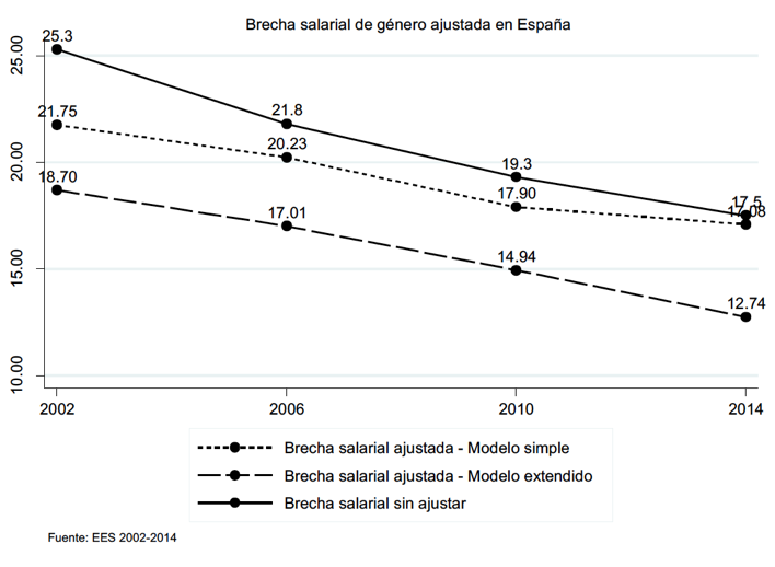 En este caso, múltiples estudios señalan que la "brecha de género" en España oscila entre el 10 y el 15%. Según la Comisión Europea, esta brecha se situaba en el 10% en 2014, menos que Italia, Reino Unido o Finlandia, habiéndose reducido en dos puntos desde 2010. Otro estudio encuentra resultados muy parecidos, tras concluir que la citada brecha lleva reduciéndose desde 2002.