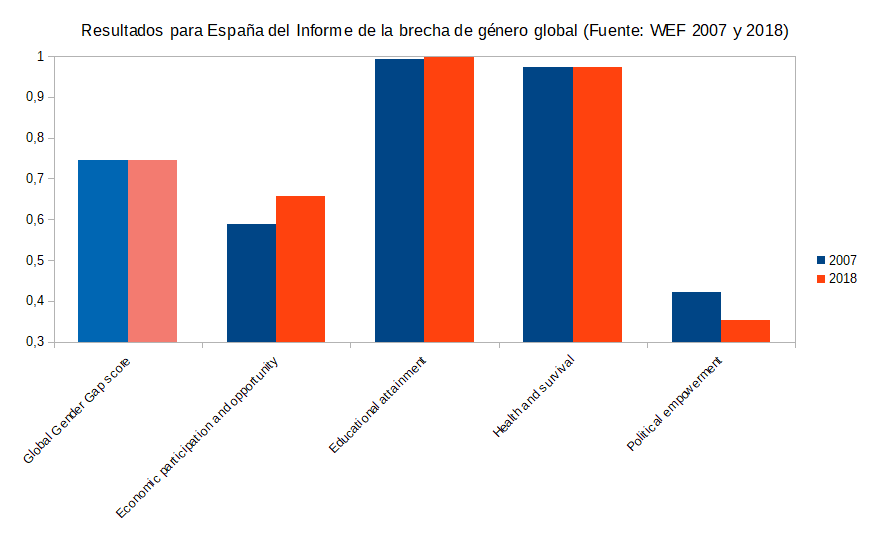 Pese a todo, debe señalarse que ambos indicadores han mejorado notablemente. Por tanto, es falso decir que se ha producido un retroceso en materia de igualdad de género en España. Se ha mejorado, y, si no se ha avanzado tanto como se quería, no se debe a falta de avances en oportunidades laborales, sino a la pérdida de oportunidades en el ámbito político.