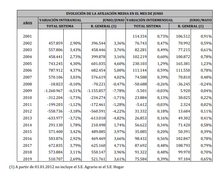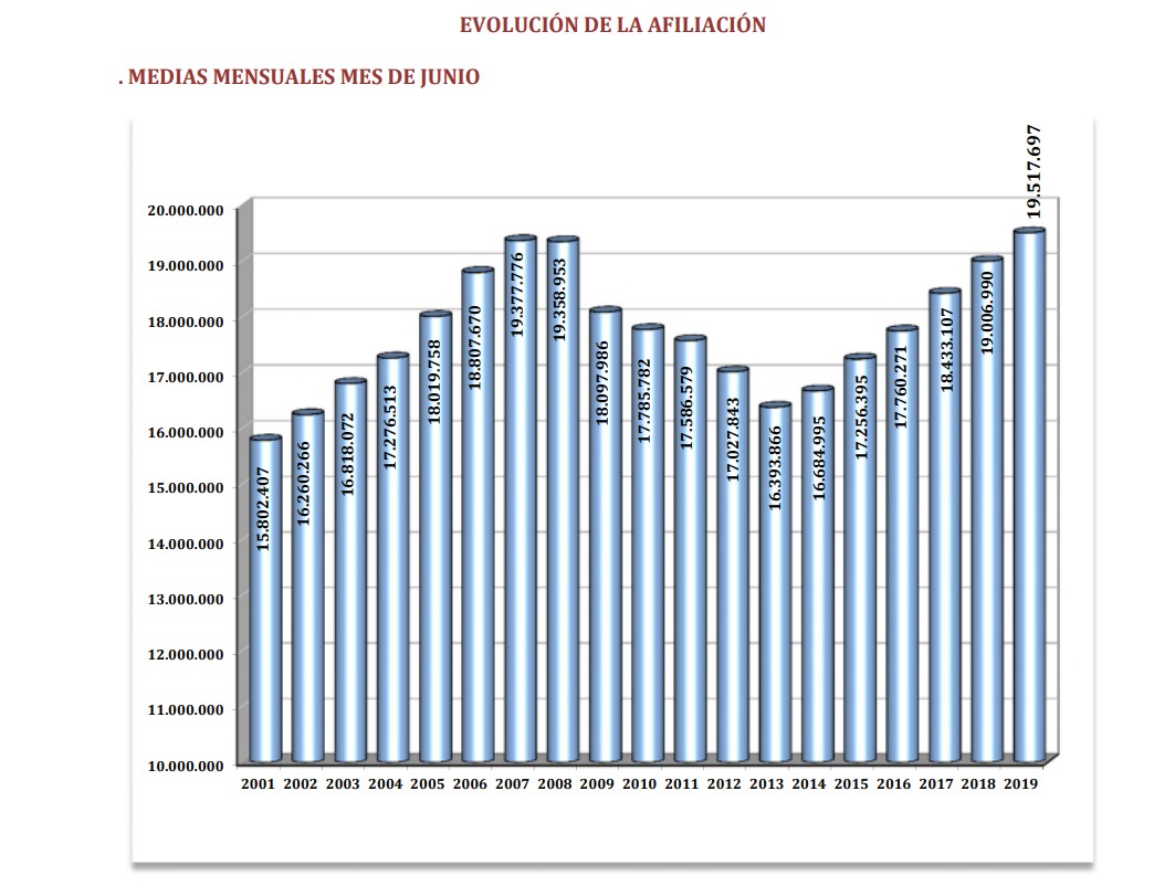 Como puede verse en la tabla, fue en los meses de junio de 2005 y 2006, en la antesala del pinchazo de la burbuja, cuando la afiliación interanual superaba los 700.000 ocupados. Ya en junio de 2009, el mercado laboral había dado un giro de 180 grados y destruía más de 1,2 millones de empleos en un año.
