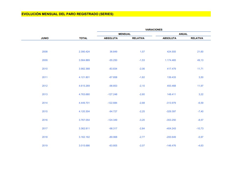 Otro golpe a los datos del paro es que ese recorte de 63.805 desempleados en las oficinas de los servicios públicos de empleo (antiguo Inem) supone su menor descenso en este mes desde 2009, cuando disminuyó en 55.250 personas. Eso sí, el dato positivo es que tras el descenso de junio, el cuarto consecutivo, el volumen total de parados se situó en 3.015.686 desempleados, su nivel más bajo desde noviembre de 2008 y a punto de romper la barrera de los 3 millones.