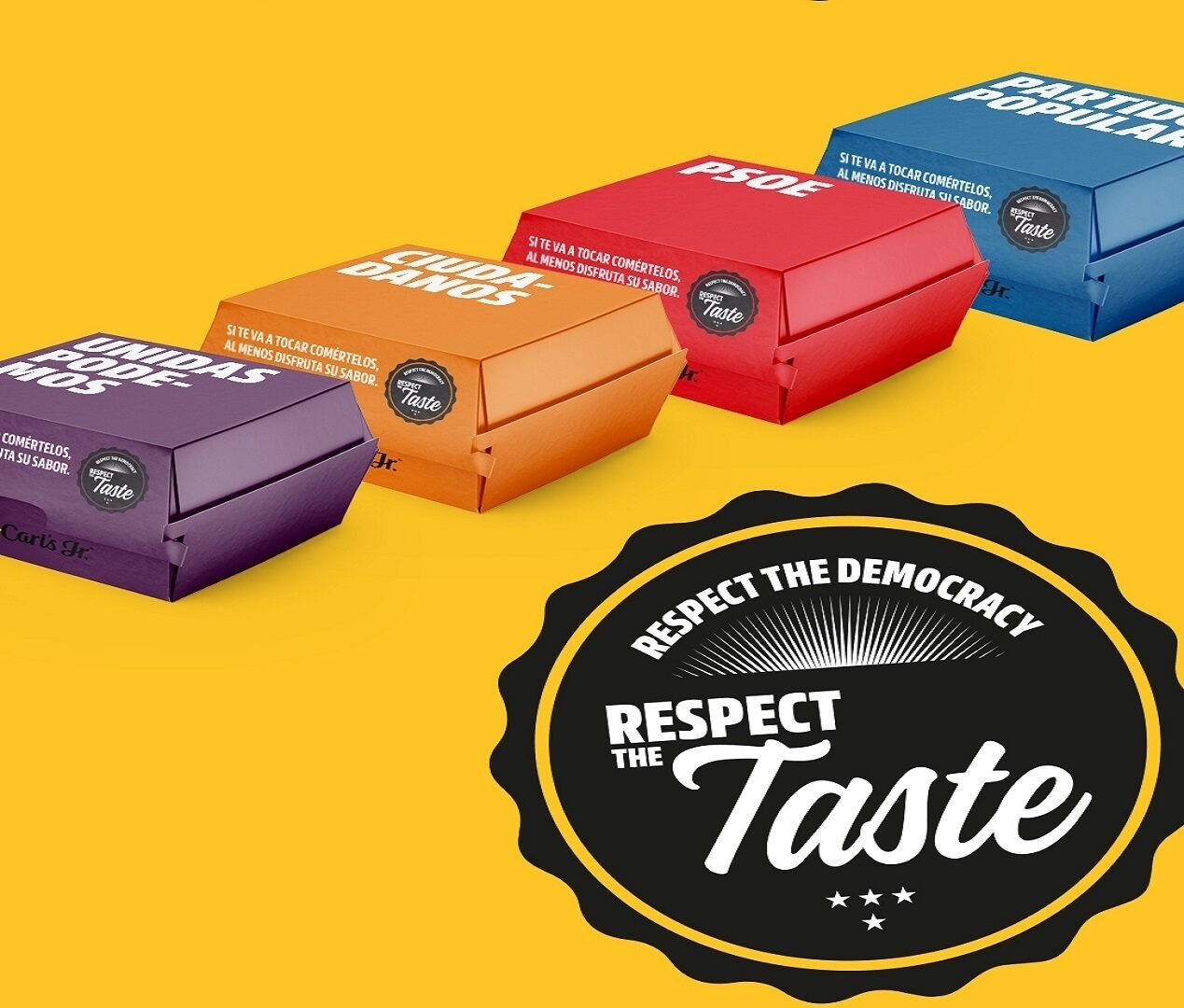 En el marco de la campaña, cuyo eslogan es "Respect The Democracy. Si nos va a tocar comérnoslo, al menos disfrutemos de su sabor", Carl's Jr. ha creado así 5 cajas diferentes, una por cada partido. Cada una tiene su color corporativo (rojo, azul, naranja, morado y verde) y el nombre del partido (PSOE, PP, Ciudadanos, Podemos y VOX). Además de la caja, también ha personalizado el papel con el que se envuelve la hamburguesa.