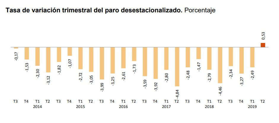Todo indica que el mercado de trabajo ha pasado de la desaceleración en el ritmo de creación de empleo hacia la destrucción y en los próximos meses veremos un empeoramiento. Con los peores datos industriales de los últimos años y la inversión flaqueando por la elevada incertidumbre, es cuestión de tiempo que el mercado de trabajo empeore. Además, lo hace especialmente en el segmento juvenil y en las mujeres, dos de los grandes colectivos protegidos por el presidente del Gobierno.