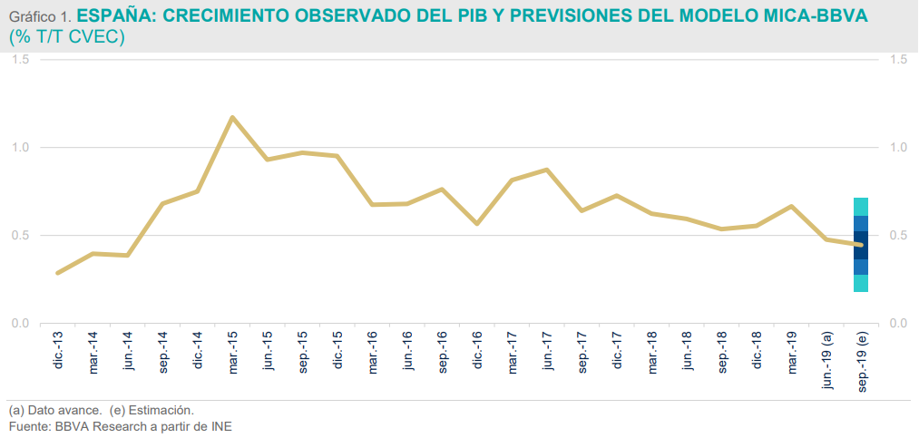 El crecimiento del PIB sorprendió a la baja en el segundo trimestre, tras aumentar un 0,5%, dos décimas menos que en el primero. Y todo apunta a que este menor ritmo se mantendrá de aquí a finales de año. Con cerca del 20% de la información disponible para el tercer trimestre, esta entidad prevé ahora un avance del 0,5% en el tercer trimestre, como máximo.
