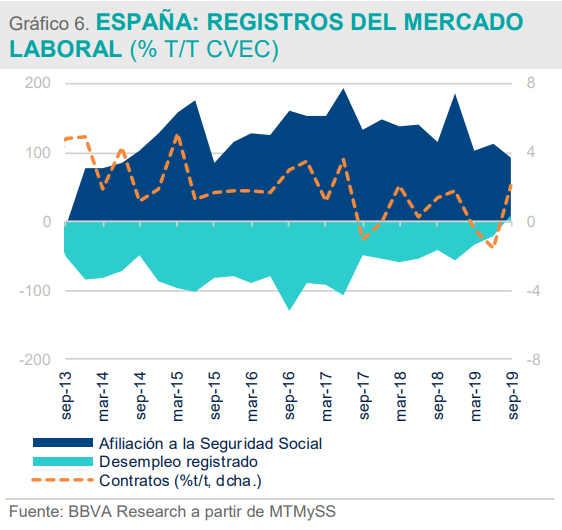 Como resultado de todo ello, "el mercado laboral da muestras de debilidad". La pérdida de atracción que ha empezado a reflejar el mercado de trabajo "se podría prolongar en el tiempo", de modo que la creación de empleo apenas avanzaría un 0,5% entre junio y septiembre, frente al 0,6% del trimestre previo. Asimismo, BBVA Research estima que el paro, una vez eliminado el efecto estacional, aumentará un 0,3% en el tercer trimestre, frente a la caída del 0,7% registrada en el segundo, lo cual supondría el primer incremento trimestral del paro desde mediados de 2013, justo antes de salir de la recesión.