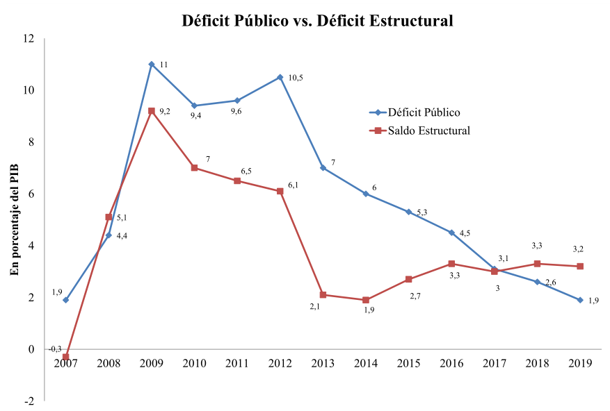 Por un lado, el país sigue registrando a día de hoy uno de los déficit más altos de la zona euro, equivalente al 2,5% del PIB en 2018, aunque inferior al límite del 3%, lo cual ha permitido abandonar el Procedimiento de Déficit Excesivo que establece la UE tras una década de reiterados e históricos incumplimientos. El Gobierno en funciones del PSOE confía en reducir esta brecha al 2% este año, gracias al aumento de la recaudación. Sin embargo, la clave no es tanto el déficit nominal como el estructural, que refleja el desequilibrio presupuestario asumiendo que la economía funciona a pleno rendimiento. Y es aquí donde saltan todas las alarmas, puesto que el esfuerzo para reducirlo no solo no es nulo, sino contrario al objetivo exigido.