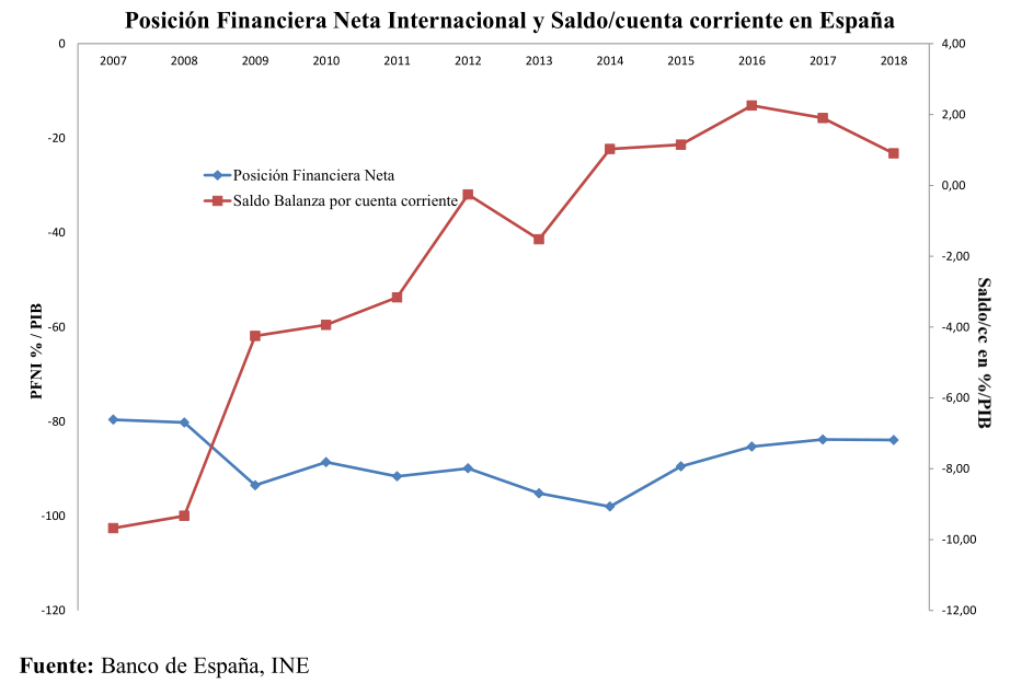 Por otro lado, la deuda externa (diferencia entre el total de activos en manos de inversores españoles y los pasivos propiedad de agentes extranjeros) se redujo de forma significativa entre 2012 y 2014, pero, desde entonces, ha recuperado su senda alcista, situándose entre las más altas de la zona euro, tan sólo superada por Irlanda, Grecia y Portugal. Otro claro signo de fragilidad.