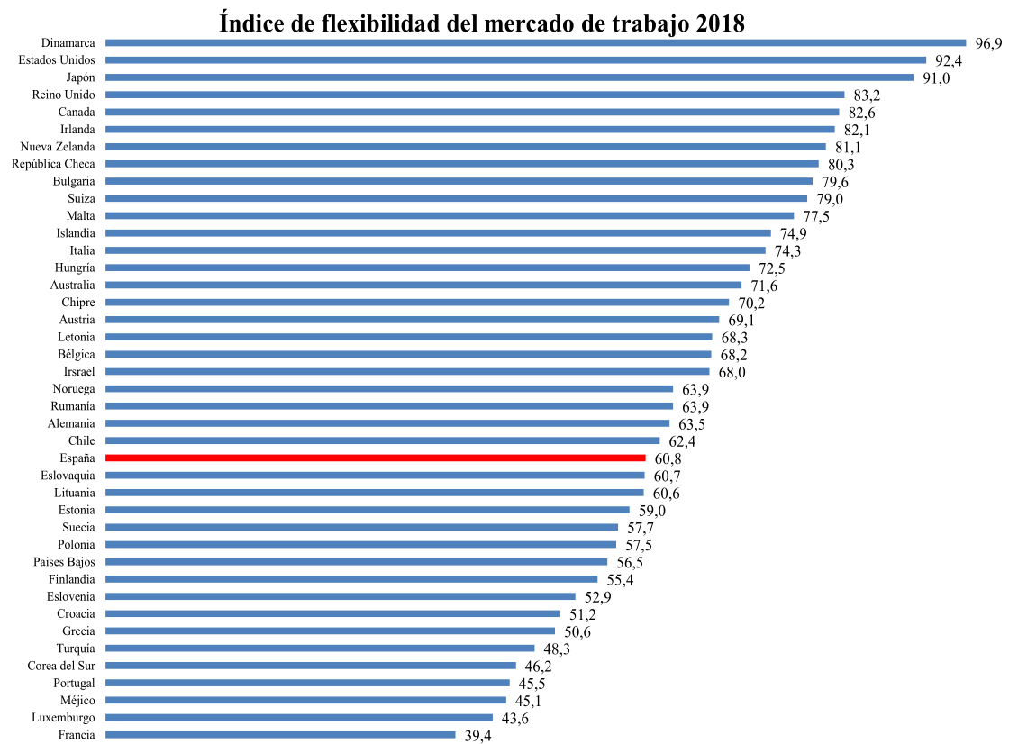 El segundo gran agujero negro es la crónica tasa de paro que padece España, no de ahora, sino desde hace 40 años. La reforma laboral de 2012 mejoró algo la situación, ya que permitió flexibilizar los costes laborales, impulsando con ello la contratación y la competitividad en plena crisis, pero el caso es que, pese a ello, el mercado de trabajo sigue siendo uno de los más rígidos de la OCDE.