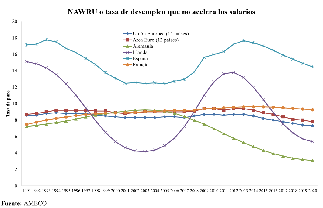 Y la mayor prueba es que el paro estructural, medido como tasa de desempleo no aceleradora de los salarios, rondaría hoy el 15%, el doble que la media de la UE (7,4%), tres veces más que Irlanda (5,71%), cinco más que Alemania (3,2%) e incluso vez y media más que la de Francia (9,34 %).
