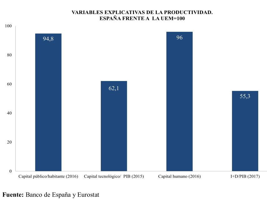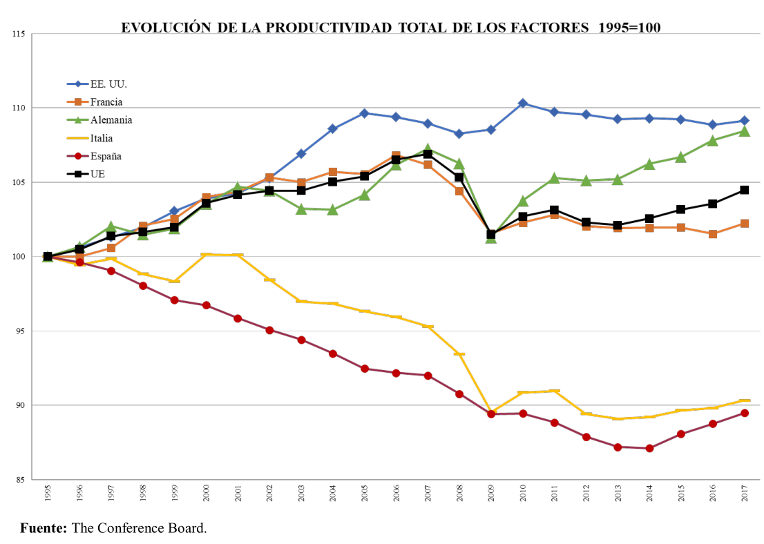 Por último, la productividad de España, cuya evolución marca el nivel de vida a largo plazo, es muy inferior a la media europea y nada apunta a que vaya a mejorar en el futuro inmediato.