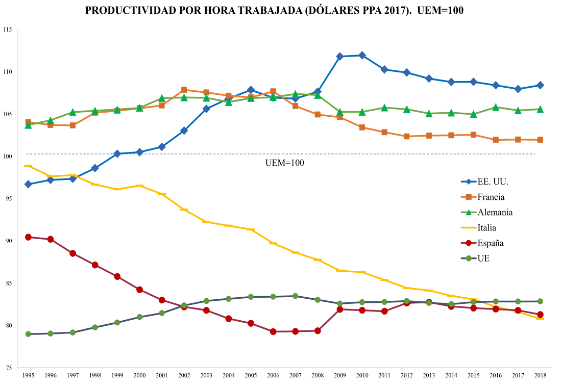 Como resultado, la productividad por hora trabajada en España apenas se sitúa en el 80% de la media europea. Y, si bien este factor ha mejorado algo entre 2009 y 2012, ha vuelto a empeorar en los últimos años, lo cual, entre otras cosas, significa que el empleo creado es de bajo valor añadido.