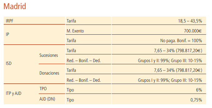 Madrid, por tanto, no es un "paraíso fiscal", tal y como afirma el PSOE, pero sirve para desenmascarar los relativos infiernos fiscales que existen a nivel autonómico. El siguiente cuadro resume los tipos que, hoy por hoy, se aplican en Madrid a nivel tributario, tanto en IRPF como en el Impuesto sobre el Patrimonio (IP), Sucesiones y Donaciones (ISD) o Transmisiones Patrimoniales y Actos Jurídicos Documentados (ITP y AJD).