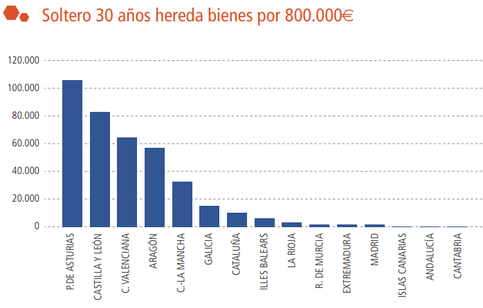 Algo similar sucede en Sucesiones, donde una herencia de 800.000 euros soportaría una carga próxima a 1.600 euros en Madrid frente a los 103.000 de Asturias.