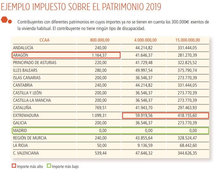 Asimismo, Madrid ha eliminado el Impuesto de Patrimonio. De este modo, aragoneses y extremeños tendrían que abonar entre 1.000 y 418.000 euros al año para mantener capitales de entre 800.000 y 15 millones -una vez excluidos los 300.000 euros exentos de vivienda habitual-, mientras que los madrileños pagarían cero.