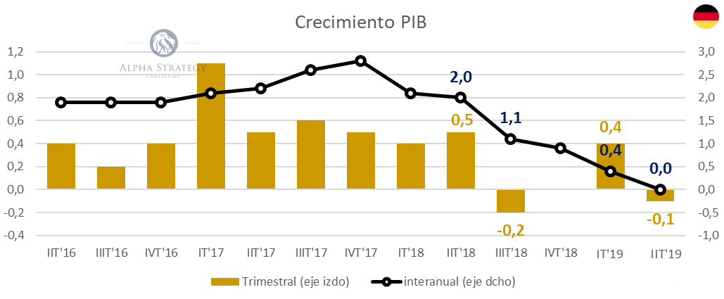 Los últimos datos reportados de PIB ya sitúan a la economía alemana en terreno negativo. El crecimiento trimestral fue del -0,1%, un dato preocupante por ser el segundo en rojo de los últimos cuatro trimestres. En términos interanuales, el análisis tampoco arroja motivos para el optimismo. El crecimiento en el segundo trimestre de 2019 fue del 0,4% en ajustado a efectos del calendario (0,0% dato original sin ajustar).