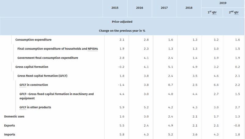En definitiva, Alemania es un país cuya demanda doméstica aporta al PIB menos de la mitad de lo que aportaba en el segundo trimestre de 2018, a pesar del crecimiento del consumo público, y un balance neto del sector exterior que acumula 5 de los últimos 6 trimestres registrando aportaciones negativas.
