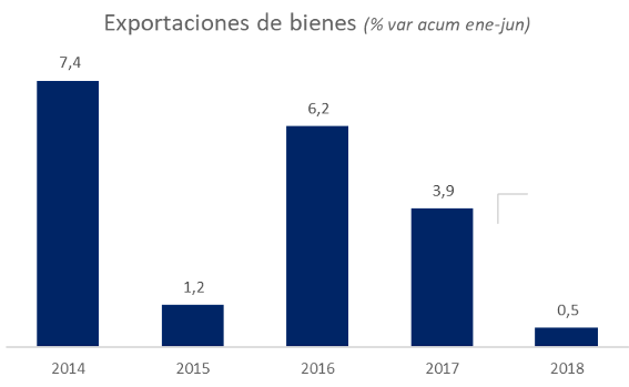 El freno económico alemán, por tanto, es su sector exterior, que acumula tres trimestres aportando negativamente al PIB. El último dato en términos netos conocido es de -0,9 puntos porcentuales, el menor dato de los últimos trimestres. La evolución de esta variable es la clave para saber la evolución de la economía alemana en lo que queda de año. Observando las exportaciones de bienes, se ve la ralentización de un sector que supone casi el 50% del PIB alemán. Estamos hablando del menor ritmo de crecimiento, en términos acumulados, desde la salida de la crisis.