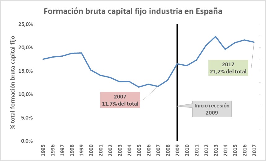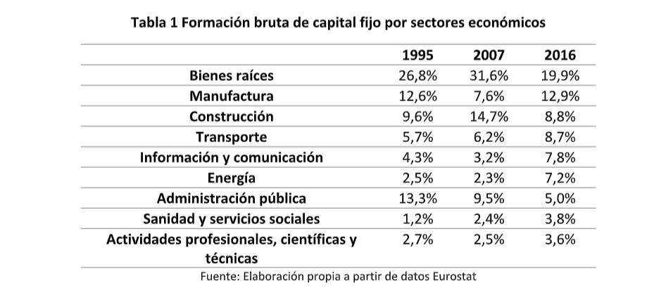 La economía española está mucho más diversificada hoy que en la anterior crisis. De hecho, la economía española dedica menos recursos (en términos relativos) hoy que en 1995 a la formación de capital fijo en construcción y los bienes raíces.