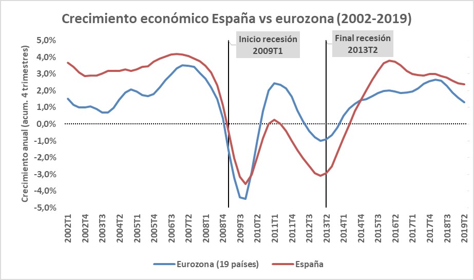Lo primero es destacar que España es uno de los países que más ha crecido de Europa desde que acabara la última recesión en 2013. El diferencial de crecimiento con la eurozona desde 2014 ha sido muy fuerte, aunque también hay que mencionar que la caída de la actividad económica antes de 2014 también fue mucho más pronunciada. También, podemos ver que la economía española crecía mucho más rápido que la economía de la eurozona antes de 2009.