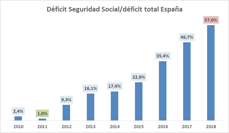 Si buscamos un culpable del déficit español, encontramos que actualmente la mayor parte de dicho déficit es debido a la Seguridad Social. La Seguridad Social entró en déficit en 2010, desde entonces acumula año tras año records de déficits. En 2018, el 57% del déficit español es explicado por el sistema de Seguridad Social. Esto es especialmente grave si consideramos que la Sanidad no se financia con fondos del sistema de Seguridad Social desde 1994, es decir, el déficit se explica únicamente por el pago de pensiones (para un análisis detallado de la rentabilidad del sistema de Seguridad Social español pulse aquí).