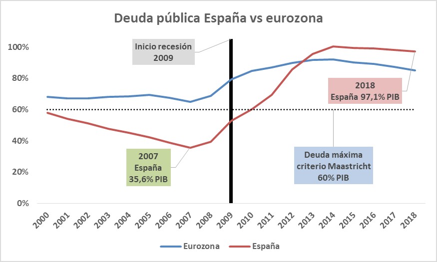 En términos de deuda pública el problema es muy similar al del déficit. España afrontó la crisis anterior con unas finanzas públicas ordenadas, en 2007, la deuda pública era minúscula comparada con el PIB (35,6% PIB). En claro contraste, 2018 muestra una cifra de deuda pública muy abultada (97,1% del PIB). La deuda pública española está muy por encima de la deuda pública de los países de la eurozona (85,1% PIB), y desde luego muy lejos también del criterio de Maastricht máximo para la deuda pública (60% PIB).