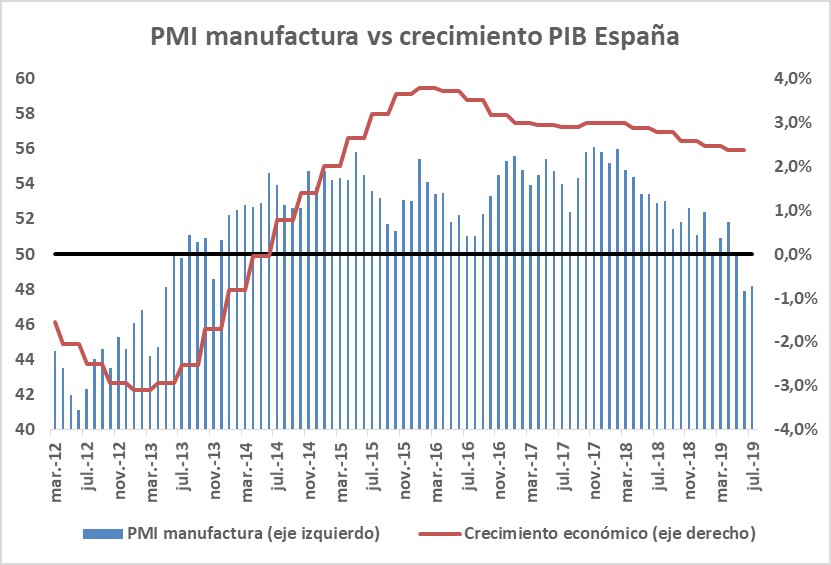 El PMI manufacturero español marca desaceleración económica desde junio de 2019 (datos inferiores a 50). En el gráfico podemos ver que la correlación con el crecimiento del PIB es muy alta. También podemos ver que el PMI se adelanta en sus movimientos al crecimiento económico. En otras palabras, el PMI manufacturero español está indicando una fuerte desaceleración en el futuro cercano.