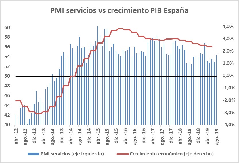 Veamos ahora los PMI de España. Los PMIs son índices de gestión de compras. Simplemente se pregunta, mediante encuestas, a los gestores de compras de empresas si han realizado más compras o menos compras que en el periodo anterior. Si más de la mitad contestan que han realizado más compras, se considera que la economía entrará en una senda de crecimiento. Si menos de la mitad contestan de forma afirmativa, se considera que la economía entrará en una senda de contracción. Este indicador no nos dice nada de las causas de la caída, pero es el mejor indicador adelantado de crecimiento del PIB.