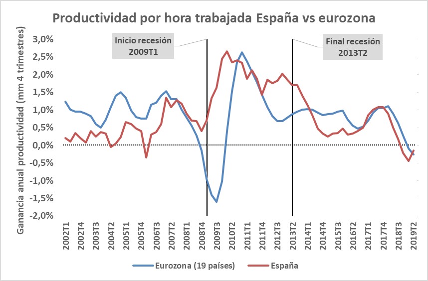 La productividad del trabajo en la economía española apenas creció antes de la recesión de 2009. El crecimiento económico no venía acompañado de los necesarios incrementos de productividad. Desde 2009, la productividad laboral española crece por encima de la productividad del resto de países de la eurozona.