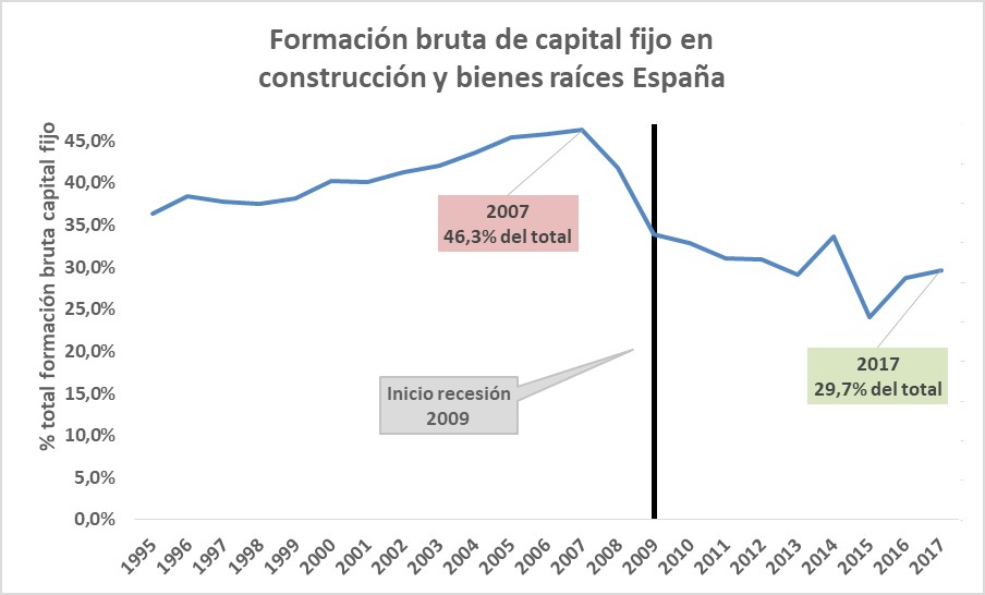 Si analizamos sólo el porcentaje de formación bruta de capital fijo en la construcción y bienes raíces, vemos como cae en picado desde 2007.
