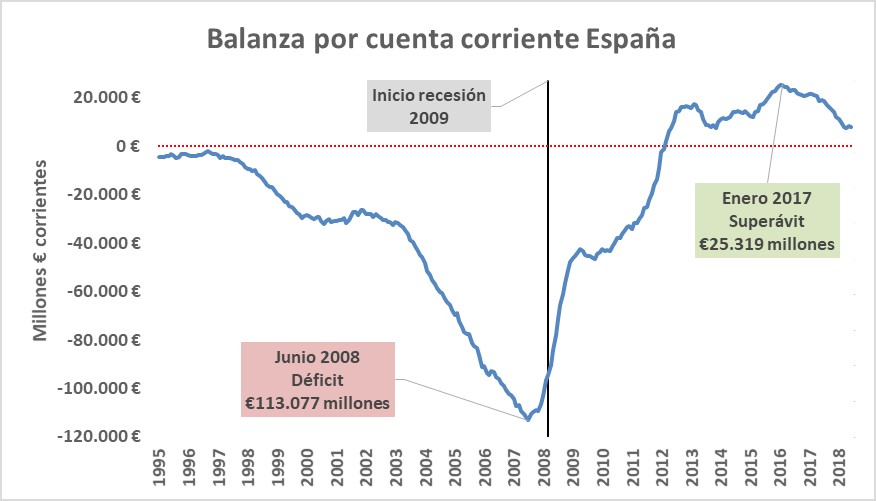 Por último, la española era una economía increíblemente dependiente de financiación externa antes de la última recesión. Desde 2013, sin embargo, España tiene un balance por cuenta corriente positivo con el resto del mundo. Esto quiere decir que llevamos más de 7 años produciendo más de lo que consumimos y devolviendo deudas pasadas.