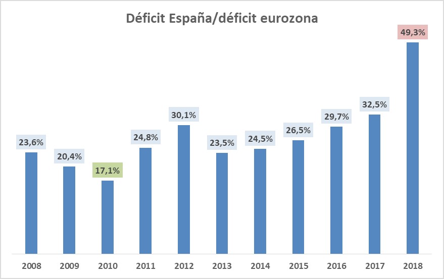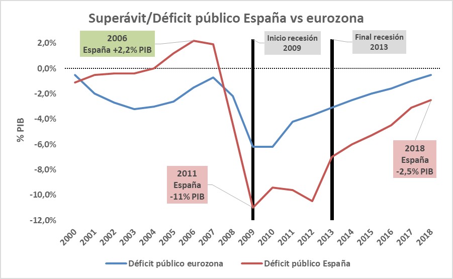 La situación de 2018 contrasta de forma considerable con la situación existente en 2006. En 2006, España contaba con un abultado superávit mientras que en 2018 existe todavía un déficit importante. De hecho, el Gobierno español es uno de los que peor hace los deberes, España es culpable de casi el 50% del déficit total de la eurozona en 2018.