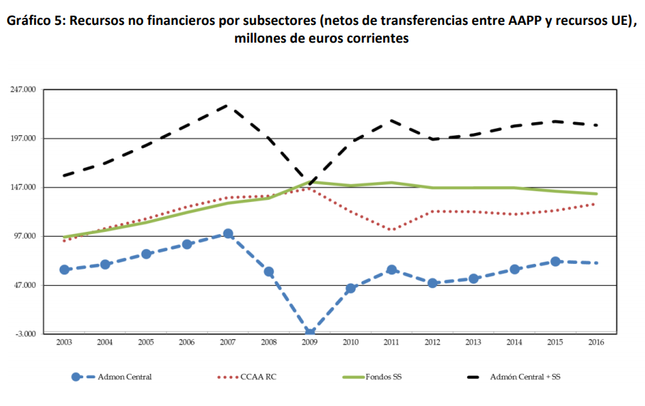 La parte positiva del sistema de financiación autonómica es que la desaceleración, que ya estamos viendo en la evolución de la recaudación tributaria, no se trasladará a las cuentas regionales hasta dentro de dos años. Por lo tanto, habrá margen de maniobra vía gasto público o tributos propios para absorber el impacto. Vean esta gráfica del informe de la comisión de expertos para la revisión del modelo de financiación autonómica para comprender el notable desfase temporal entre la recaudación tributaria y su impacto sobre los ingresos de las Comunidades Autónomas.