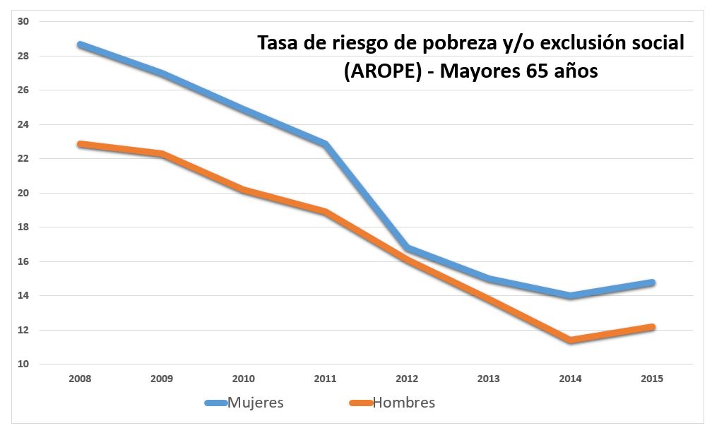 Desde 2008, los mayores de 65 años han visto cómo crecía su renta relativa (si la comparamos con la renta media del conjunto de la sociedad española), disminuían sus niveles de pobreza y se mantenía el poder adquisitivo de las prestaciones. Según el INE, el grupo de mayores de 65 años es el que tiene una tasa más baja de "riesgo de pobreza y exclusión social", tras tener en cuenta su renta neta (un punto en el que se contabiliza también el hecho de que un alto porcentaje vive en una vivienda de su propiedad por la que no paga alquiler o hipoteca).