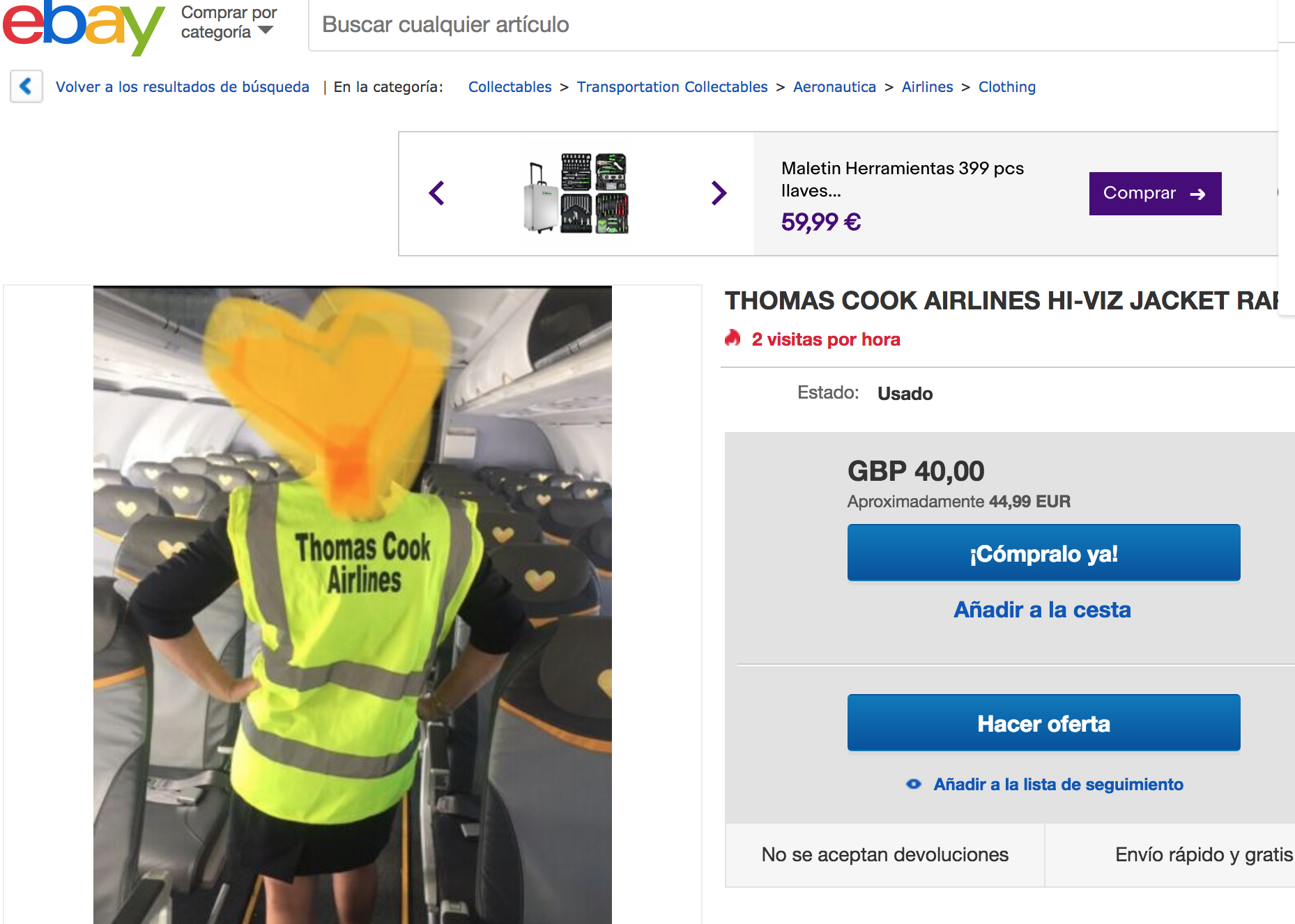 Pero si hay algo caro dentro de eBay, son los objetos del último vuelo de la aerolínea. La manta que se dio a los pasajeros en ese último viaje acumula más de 30 pujas y ya está superando los 50 euros. Sorprende también el precio que se están dispuesto a pagar por un chaleco amarillo de Thomas Cook, de los que suelen llevar los técnicos: nada más y nada menos que 100 euros.