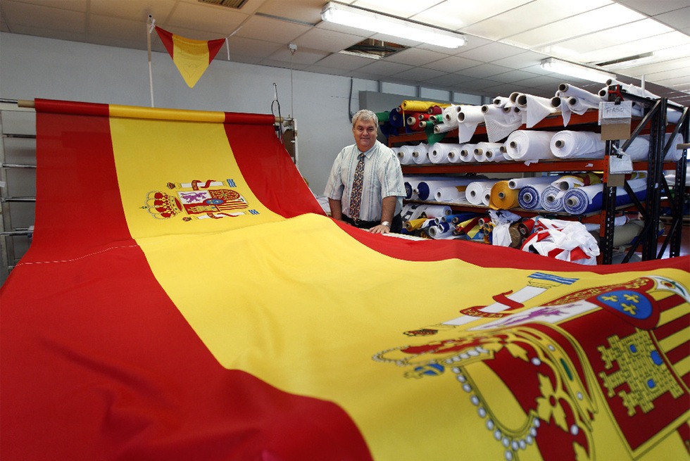 Con orgullo nos cuenta el empresario, mientras la maquinaria de su sede madrileña no cesa, que la bandera que ondea en la Plaza de Colón en Madrid, también "es de ellos".