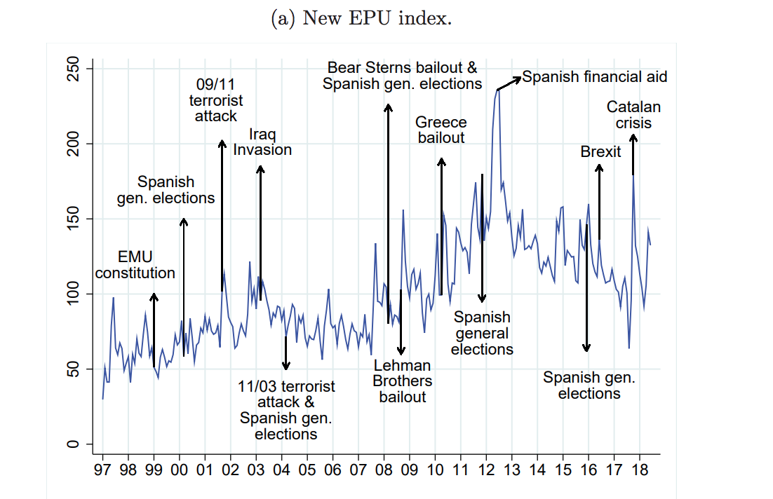 El Banco de España mide también estas cuestiones con un Índice de Incertidumbre sobre Política Económica. Como vemos en el siguiente gráfico, las menciones en la prensa a palabras con connotaciones negativas para la producción ("crisis", "deuda, "déficit", "paro", "desaceleración"...) han experimentado una subida entre 2017 y 2019, al calor de diversos eventos políticos internacionales y domésticos (Brexit, pulso separatista en Cataluña...) que contribuyen a generar un mayor grado de alarma sobre el desempeño de la economía.